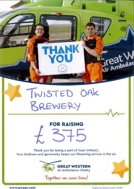 All proceeds from the raffle together with our donation from every drink sold raised a whopping £375 for the Great Western Air Ambulance Charity.